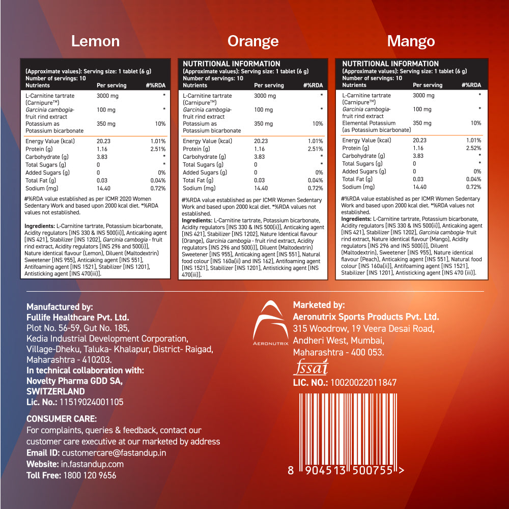 Fast&Up L-Carnitine Tartrate is a clinically tested Carnitine supplement, trademarked by the Swiss company Lonza. It is formulated with 3000mg of pure, high-quality Carnipureâ„¢. It effectively burns fat, converts stored fatty acids into cellular energy, and supports weight management, energy production, a lean and toned body, and improved athletic performance. Added 100mg Garcinia cambogia fruit extract contains Hydroxy citric acid (HCA) as an active ingredient that suppresses the fat producing enzyme citrate lyase. It also helps suppress appetite by increasing serotonin levels, which further helps reduce appetite & cravings. Water weight is caused by high sodium levels in the body and consumption of refined carbohydrates & sugar spikes insulin levels which increases sodium retention leading to increased water weight. 350mg of added Potassium helps flush out sodium, which helps reduce water weight or bloating.
