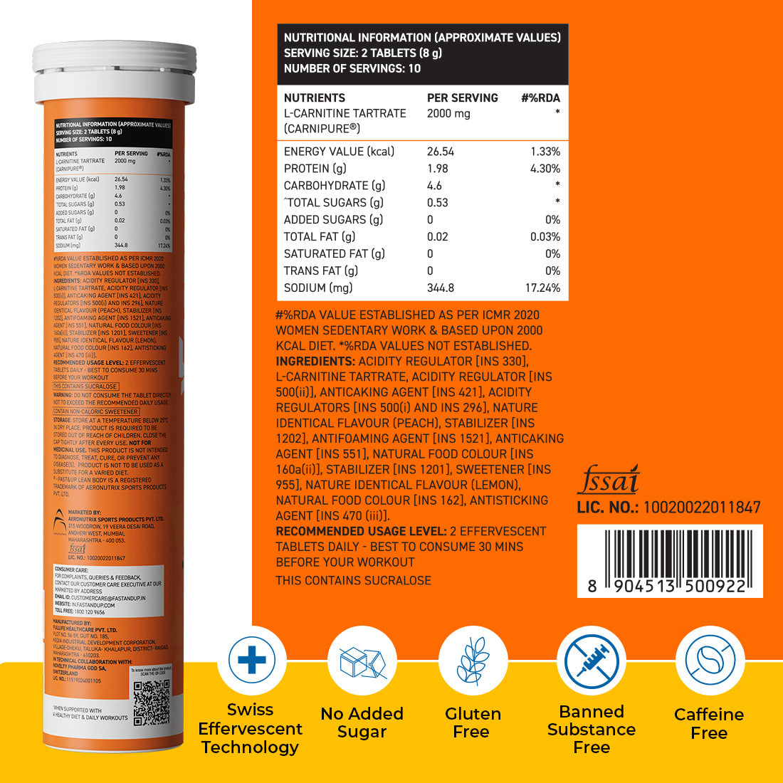 Fast&Up Lean Body is a powerful weight loss supplement with 2000mg L-Carnitine Tartrate, formulated with the purest and highly researched Carnipure™ L-Carnitine sourced from Lonza, Switzerland. Developed with Swiss Effervescent Technology, it ensures fast absorption, high bioavailability, and is gentle on the stomach. L-Carnitine acts as a fuel by carrying stored fat to the mitochondria, where it is burned and converted into energy. This helps boost metabolism, support fat loss, and provide sustained energy for workouts. Completely safe and effective, this L-Carnitine supplement not only aids in fat reduction but also supports muscle recovery and enhances performance, making it one of the best fat burner and workout recovery supplements in India.