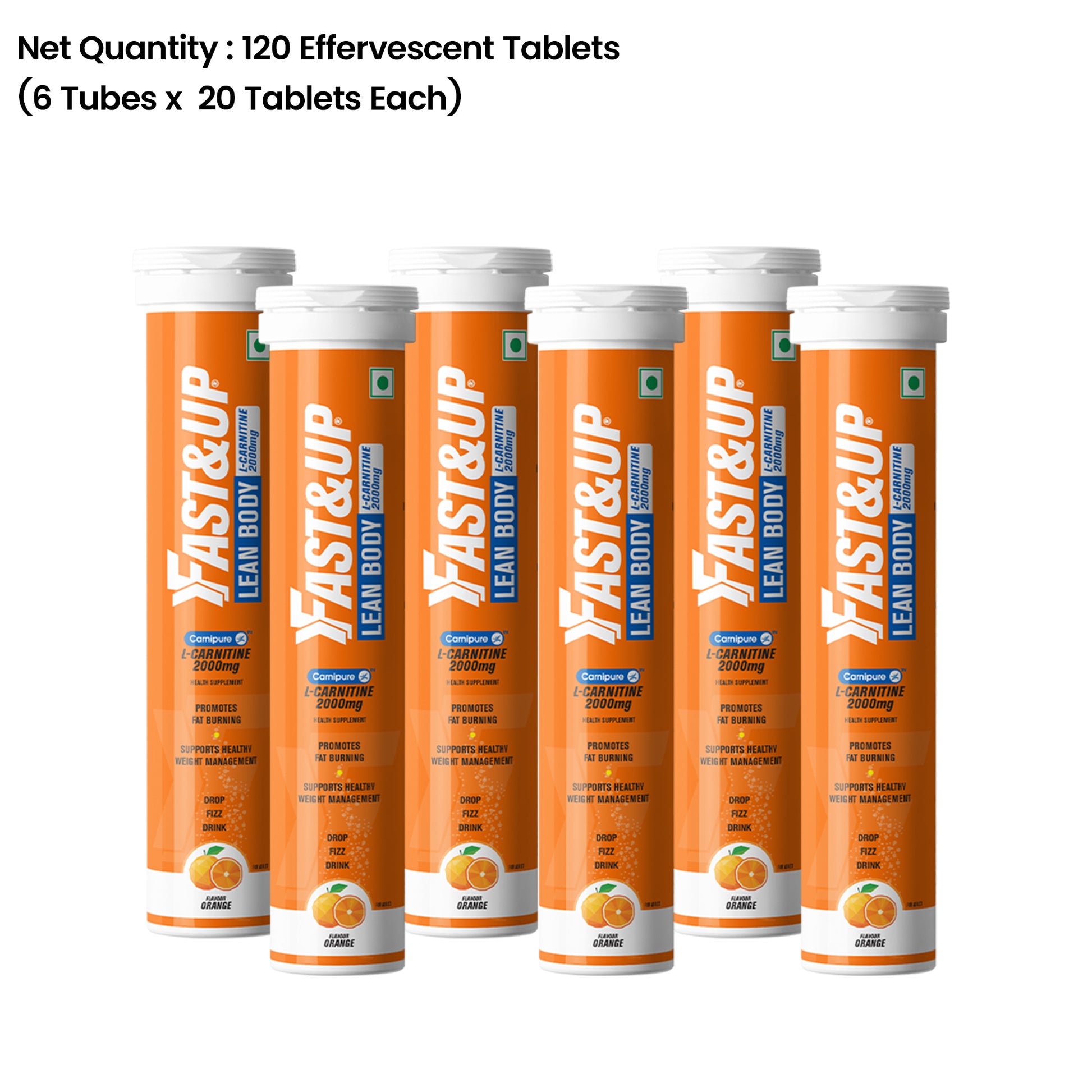 Fast&Up Lean Body is a clinically researched weight loss supplement formulated with 2000mg L-Carnitine Tartrate, made with the purest Carnipure™, one of the most trusted and well-studied forms of L-Carnitine in the world. Developed using Swiss Effervescent Technology, it offers faster absorption, no added sugar, and is gentle on the stomach, unlike many conventional fat burner supplements in India. Available in refreshing lemon and orange flavours, it stands out as one of the best L-Carnitine supplements for weight and fat loss in India.