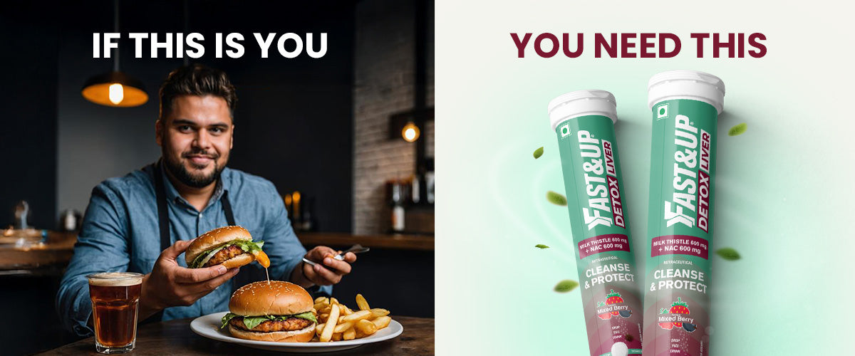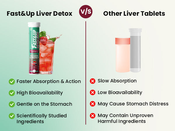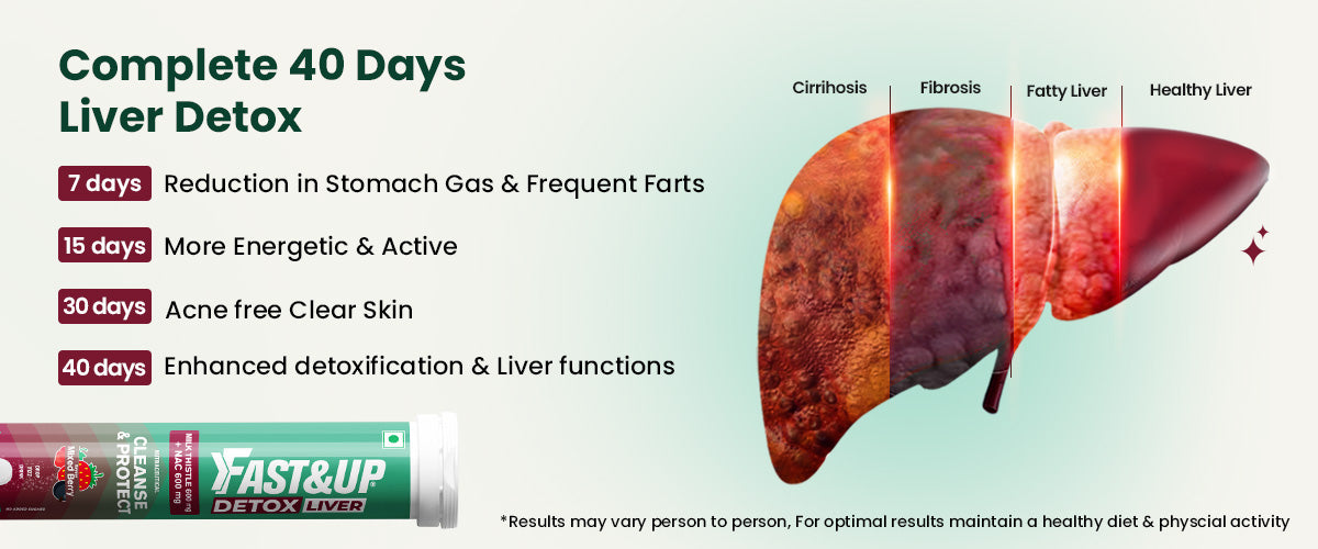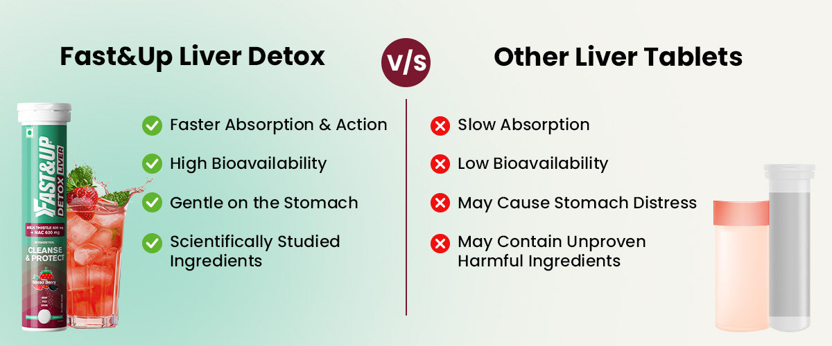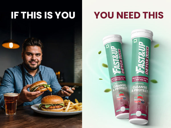 Consumption of alcohol, junk food, lack of exercise, heavy supplements, etc. builds up load of harmful toxins and fat deposition on the liver. The liver, the body's largest internal organ, plays a crucial role in metabolizing and eliminating toxins from alcohol and medications. Fast&Up Liver Detox, with 600 mg Milk Thistle extract and 600 mg N-Acetylcysteine (NAC), synergistically cleanses and protects your liver from these toxins. NAC helps in the synthesis & increase of Glutathione levels in the body. Glutathione is a powerful antioxidant which is vital for proper liver functioning since it helps to neutralize the harmful toxins accumulated in the liver from the consumption of alcohol & medications. Milk Thistle helps to preserve the Glutathione levels in the body, ensuring long-lasting antioxidant action for your liver. Milk Thistle is also validated to significantly help reduce inflammation & damage caused to the liver cells by unwanted fatty liver deposition. Silymarin, the bioactive of Milk Thistle helps to regenerate new liver cells which promotes recovery of your liver and helps to make it healthy again. Fast&Up Liver Detox formulated with Swiss Effervescent Technology supports faster absorption of nutrients & high bioavailability without any GI distress. "