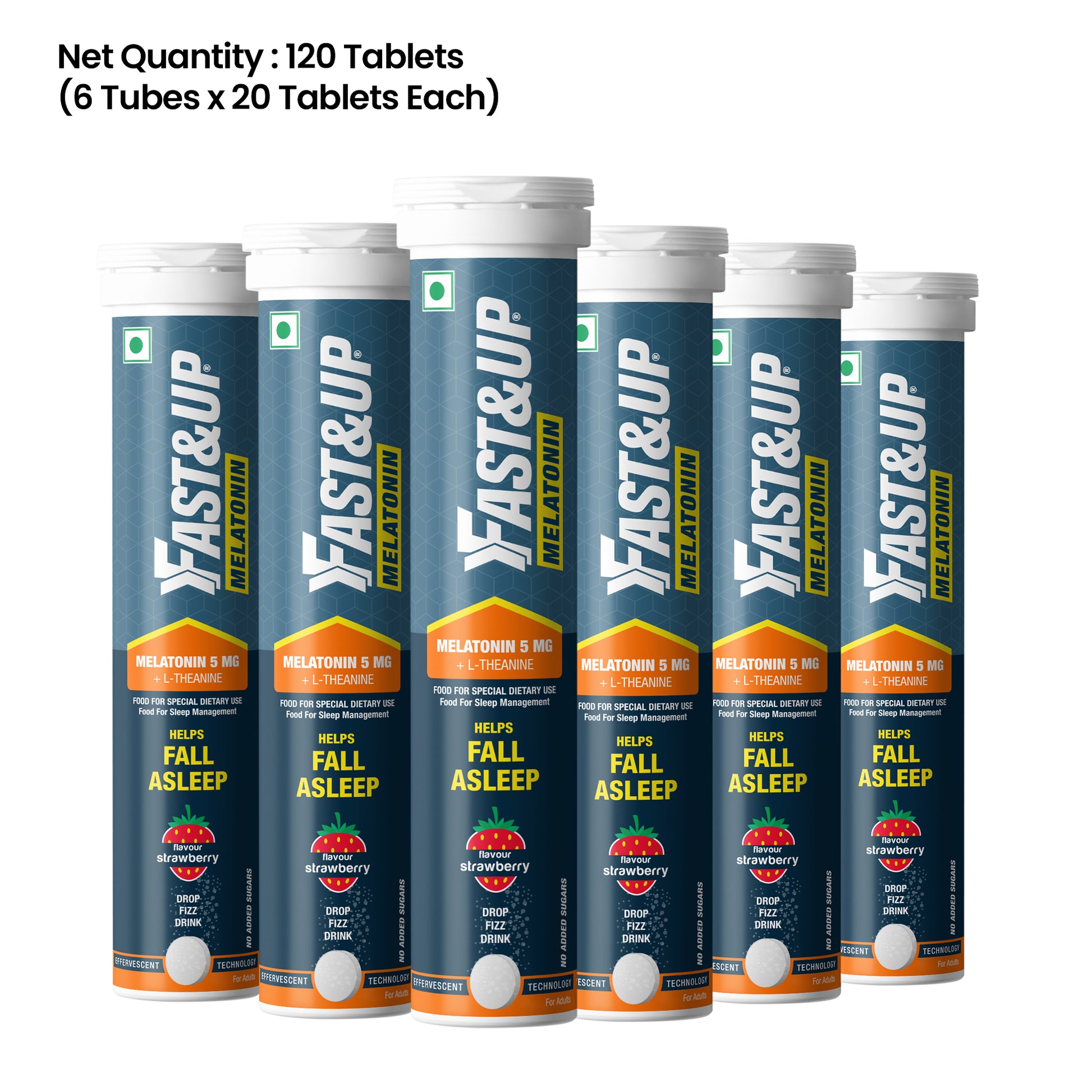 Fast&Up Melatonin contains a combination of 5 mg Melatonin which helps reduce the time to fall asleep and added 100 mg L-Theanine which helps relax nerves for deep sleep and helps you wake up feeling refreshed the next day.