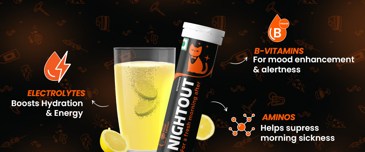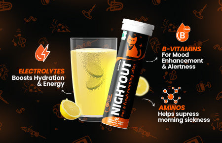 NightOut contains added Instant Electrolytes such as Sodium, Potassium, Magnesium and Calcium along with a blend of Amino Acids & B-Vitamins which helps you wake up fresh & energetic after a night of celebration. It has Zero Sugar and is available in refreshing Fizzy Lemon flavour Non-Habit Forming, High Bioavailability, Fast Absorbing, Gentle on stomach with no Known Side Effects