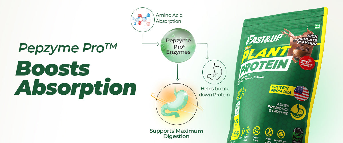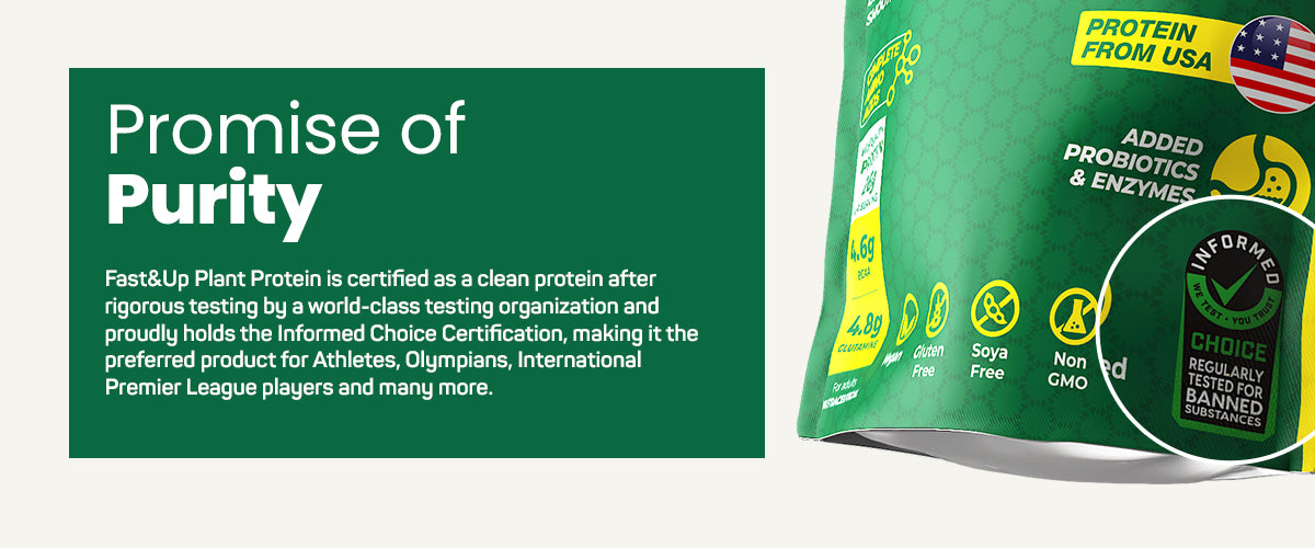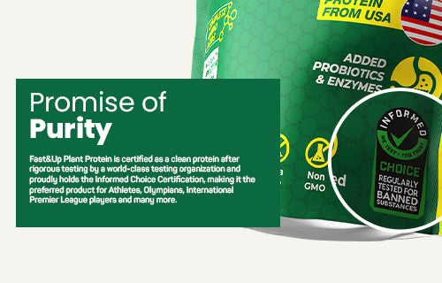 Fast&Up Plant Protein is now in a new & innovative formula containing Plant Protein Isolate providing complete amino acid profile with added digestive enzymes and probiotics. This delicious plant protein has Instant mixability, smooth and creamy texture and has no chalky or grainy feeling. It contains 26g of Plant Protein Isolate – Pea and Brown rice protein with naturally occurring 4.6g BCAA and 4.8g Glutamine per serving that supports muscle health, faster recovery and prevents muscle breakdown. Fast&Up Plant Protein is sourced from USA and is Informed Choice Certified with every batch tested in the UK for banned substance prohibited by WADA to provide quality and is safe for athletes, body builders and fitness enthusiasts.