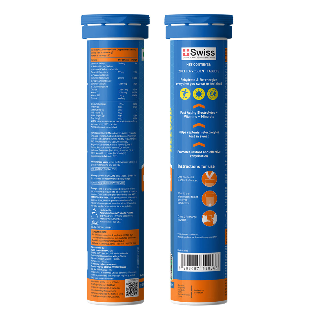 Fast&Up Reload is an effervescent hypotonic hydration and energy drink formulated with an optimal blend of five essential electrolytes—Sodium, Potassium, Magnesium, Calcium, and Chloride—to support rapid hydration and sustained energy. It is enriched with added Vitamin C and Vitamin B12 to help keep you active and energized throughout the day.