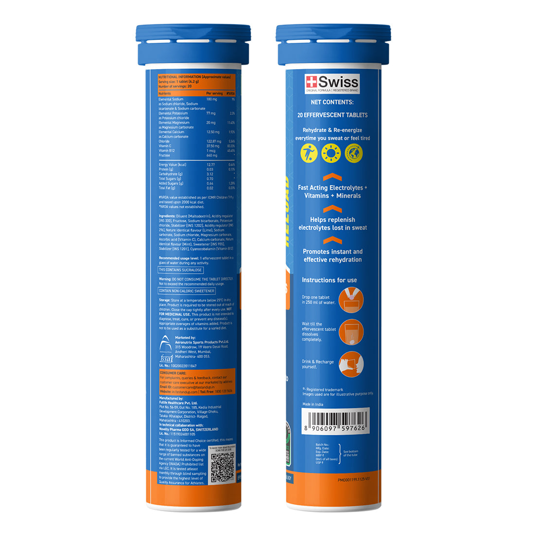 Diluent (Maltodextrin), Acidity regulator [INS 330], Fructose, Acidity regulator [INS 500(ii)], Potassium chloride, Acidity regulator [INS 500(i)], Nature identical flavour (Lime), Acidity regulator [INS 296], Stabilizer [INS 1202], Sodium chloride, Magnesium carbonate, Ascorbic acid (Vitamin C), Calcium carbonate, Nature identical flavour (Mint), Sweetener [INS 955], Stabilizer [INS 1201], Cyanocobalamin (Vitamin B12).