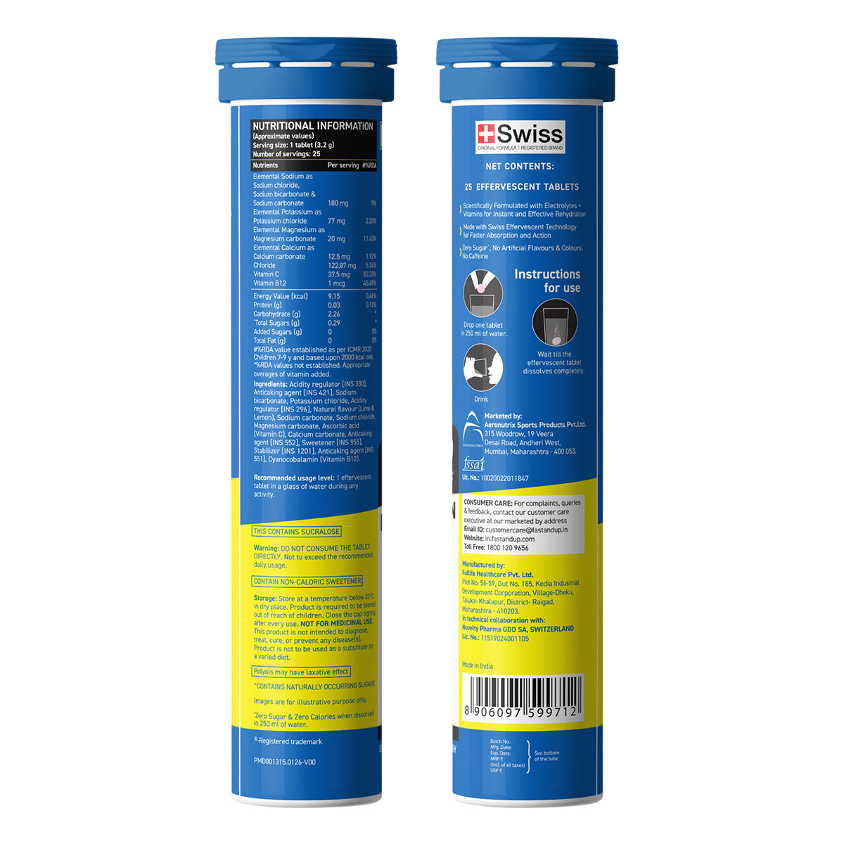 Acidity regulator [INS 330], Anticaking agent [INS 421], Sodium bicarbonate, Potassium chloride, Acidity regulator [INS 296], Natural flavour (Lime & Lemon), Sodium carbonate, Sodium chloride, Magnesium carbonate, Ascorbic acid (Vitamin C), Calcium carbonate, Anticaking agent [INS 552], Sweetener [INS 955], Stabilizer [INS 1201], Anticaking agent [INS 551], Cyanocobalamin (Vitamin B12).